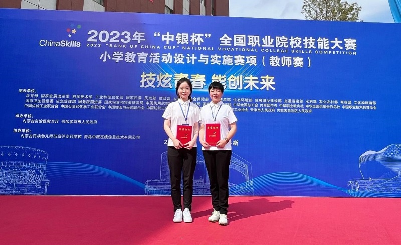 8月23日至26日,由教育部、国家发展改革委等35个部门共同主办,内蒙古自治区教育厅、鄂尔多斯市人民政府承办的2023年全国职业院校技能大赛高职组小学教育活动设计与实施赛项(教师赛)在内蒙古民族幼儿师范高等专科学校举行。本次比赛共有来自全国45支参赛队的90名选手同台竞技,共评出5个一等奖、9个二等奖、14个三等奖。我校参赛队作为江苏省2支代表队之一参加比赛。通过激烈角逐,我校朱萍、吴易霏两位教师选手在比赛中表现出色,展现了精湛的技能水平,以总分第7名荣获二等奖,实现了我校教师在全国职业院校技能大赛教师赛道成绩的新突破。