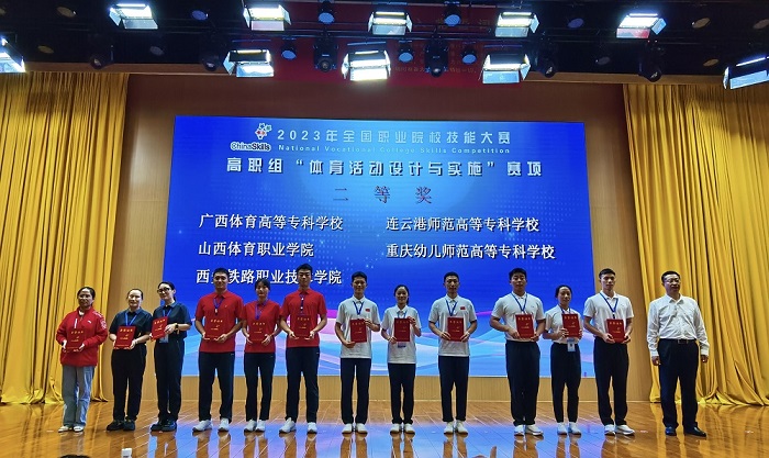 9月22日至25日,由教育部、国家发展改革委等35个部门共同主办,山东省教育厅、日照市人民政府承办的2023年全国职业院校技能大赛高职学生组“体育活动设计与实施”赛项在日照职业技术学院举行。本次比赛共有来自全国49支参赛队的147名选手同台竞技,共评出5个一等奖、10个二等奖、15个三等奖。我校参赛队作为江苏省2支代表队之一参加比赛,副校长丁红星带队参赛。通过激烈角逐,我校冯晔暄、马宁、刘海俭三位选手在比赛中表现出色,展现了精湛的技能水平,最终斩获二等奖。