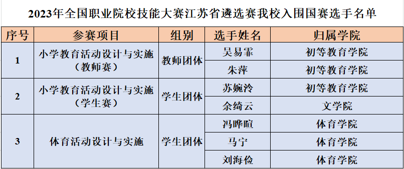 近日,2023年全国职业院校技能大赛江苏省遴选赛各赛项陆续落下帷幕,我校共参加了8个赛项的比拼。经过激烈角逐,我校参加“小学教育活动设计与实施”教师赛、学生赛和“体育活动设计与实施”3个赛项的参赛队,均以排名第二的总成绩获得了国赛参赛资格,7名师生将作为江苏省代表队成员参加2023年全国职业院校技能大赛。